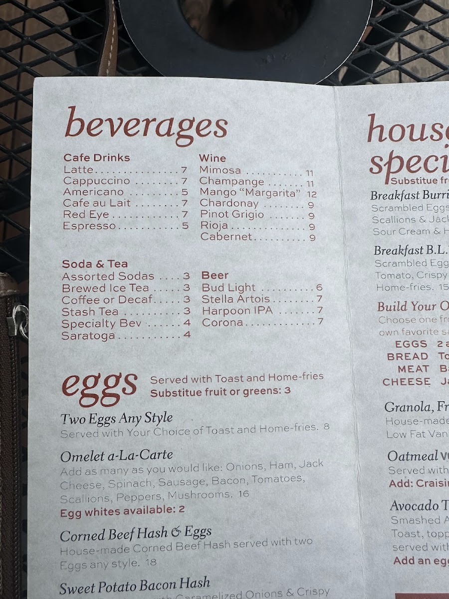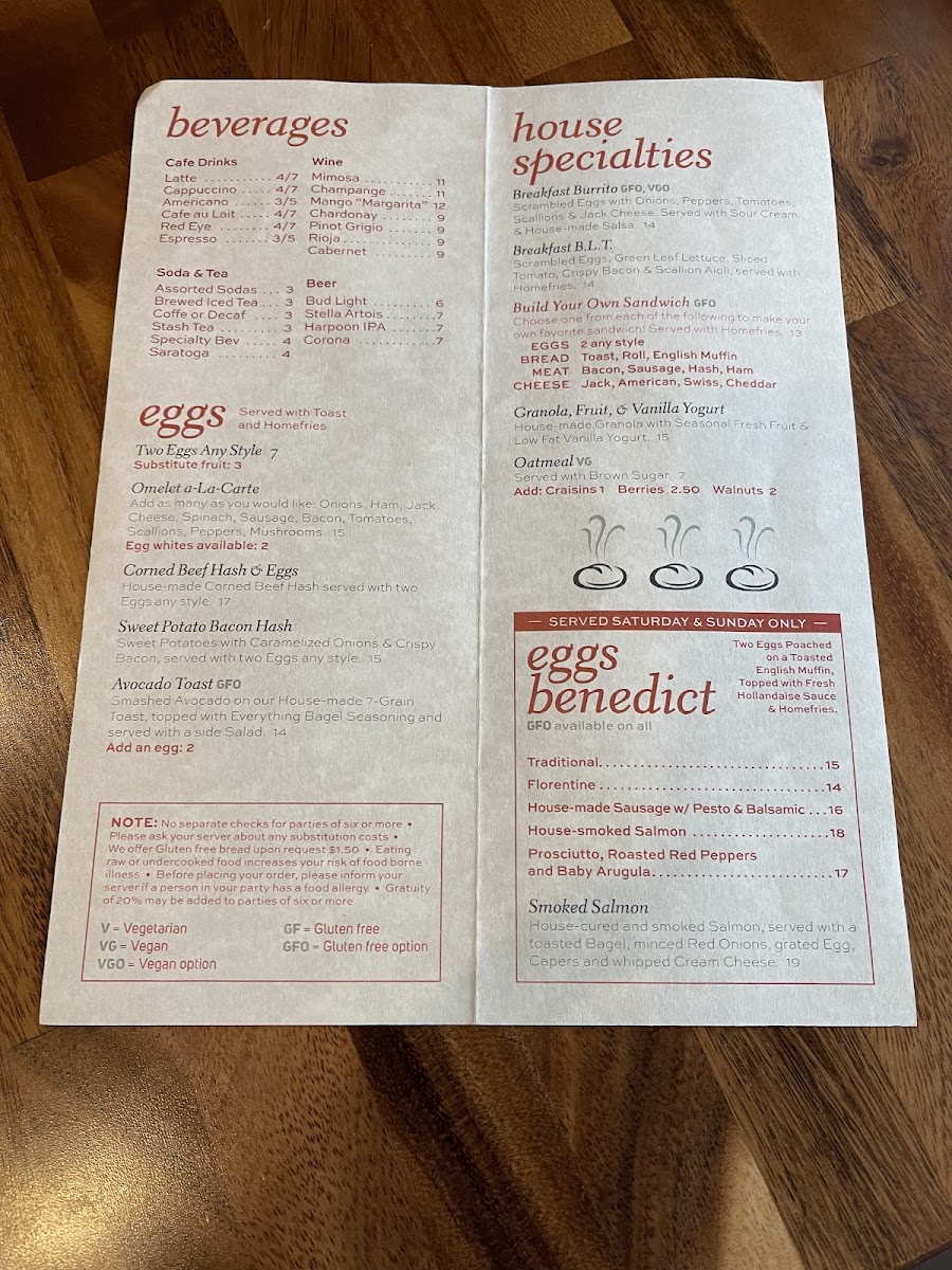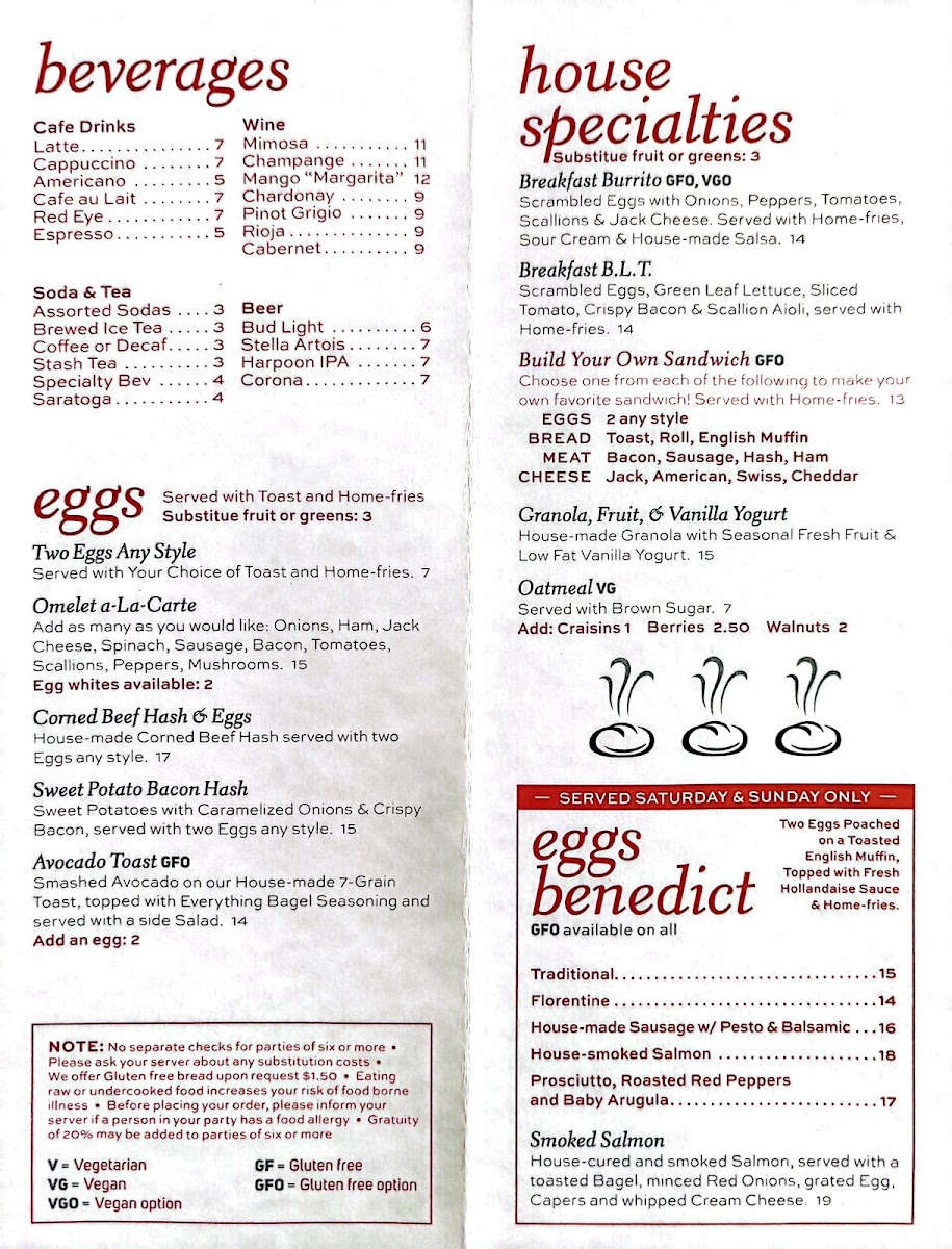 Sweet potatoes with caramelized onions & crispy bacon served with two eggs any style a side of homefries & toast.